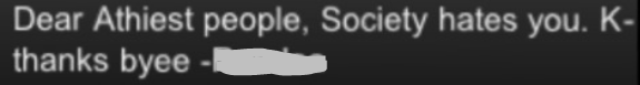 Social media also gives a platform for spreading hate by the average person on the street, such as I witnessed this-morning on Twitter when the below tweet (which I have cropped down to hide the Tweeter’s full ID due to her young age), appeared, informing Atheists that “society hates you”, and this apparently from a 13 year old, whom you would have to assume is sprouting the venom of a parent or some such influencing figure.