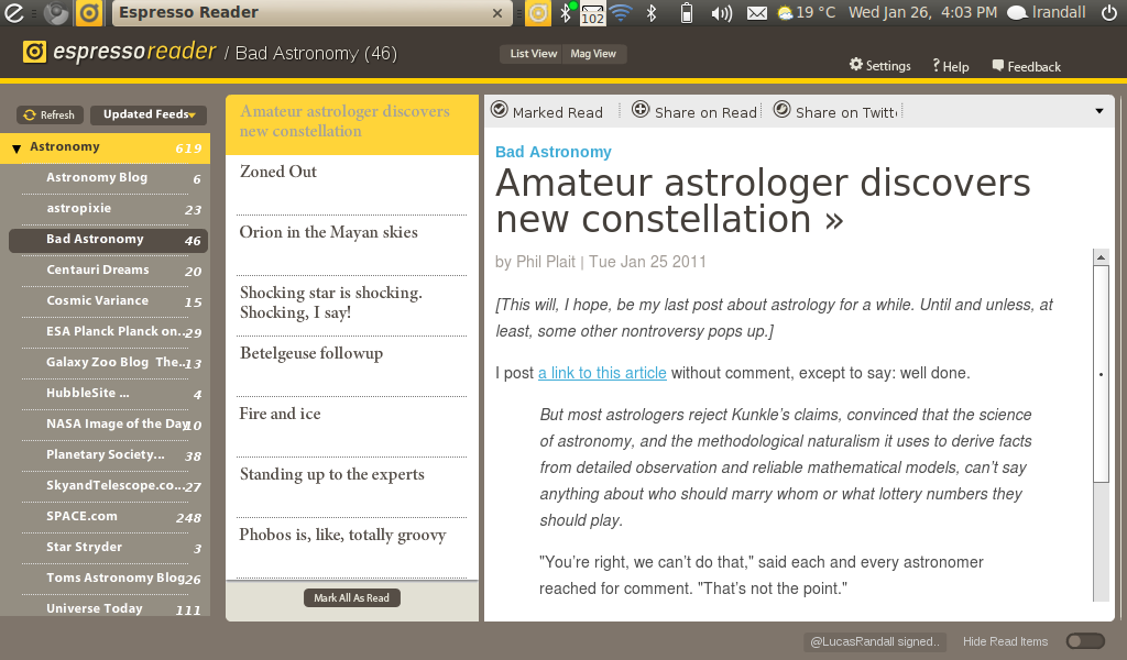 On the media-consumption side I have been a long-time user of Google Reader, once again due to its open API, allowing many different vendors the ability to create their own clients and interfaces, saving me the trouble of subscribing to many RSS feeds repeatedly from my multitude of devices. When I discover a new site, blog, or news-source I wish to read regularly (my Google Reader stats show that Dr. Phil Plait’s simply wonderful ‘Bad Astronomy’ blog is my most oft-viewed source), I simply add the site’s RSS feed to my Google Reader account, and then use my favourite Google Reader client on whichever device I’m using to read or view content.