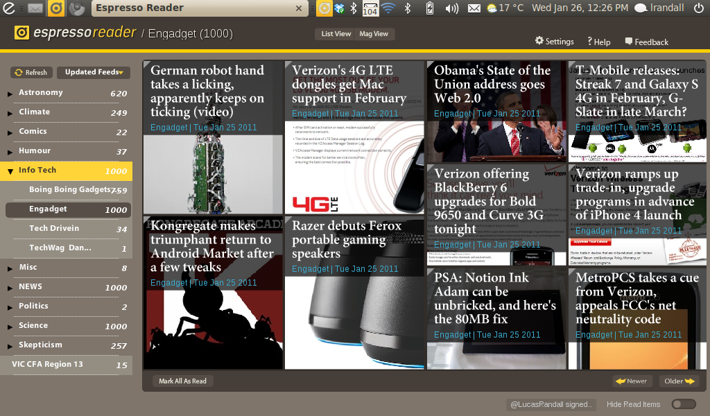 My feed-reading activities have become a little more enjoyable this week, with the release of the latest version of Espresso Reader, an Adobe Air-based cross-platform Google Reader client, which presents feeds in a clever, visually pleasing ‘magazine’ style (see below).
