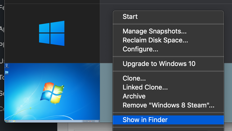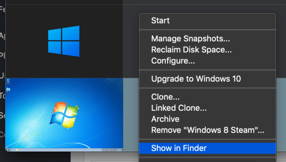 An addition to the above procedure outlined by flackshack, you need to delete the link between the clone and the base image. To do this, first browse to your image file on your Mac’s hard drive. You can do this by right-clicking on a VM in your Parallels Control Center, then selecting ‘Show in Finder’.